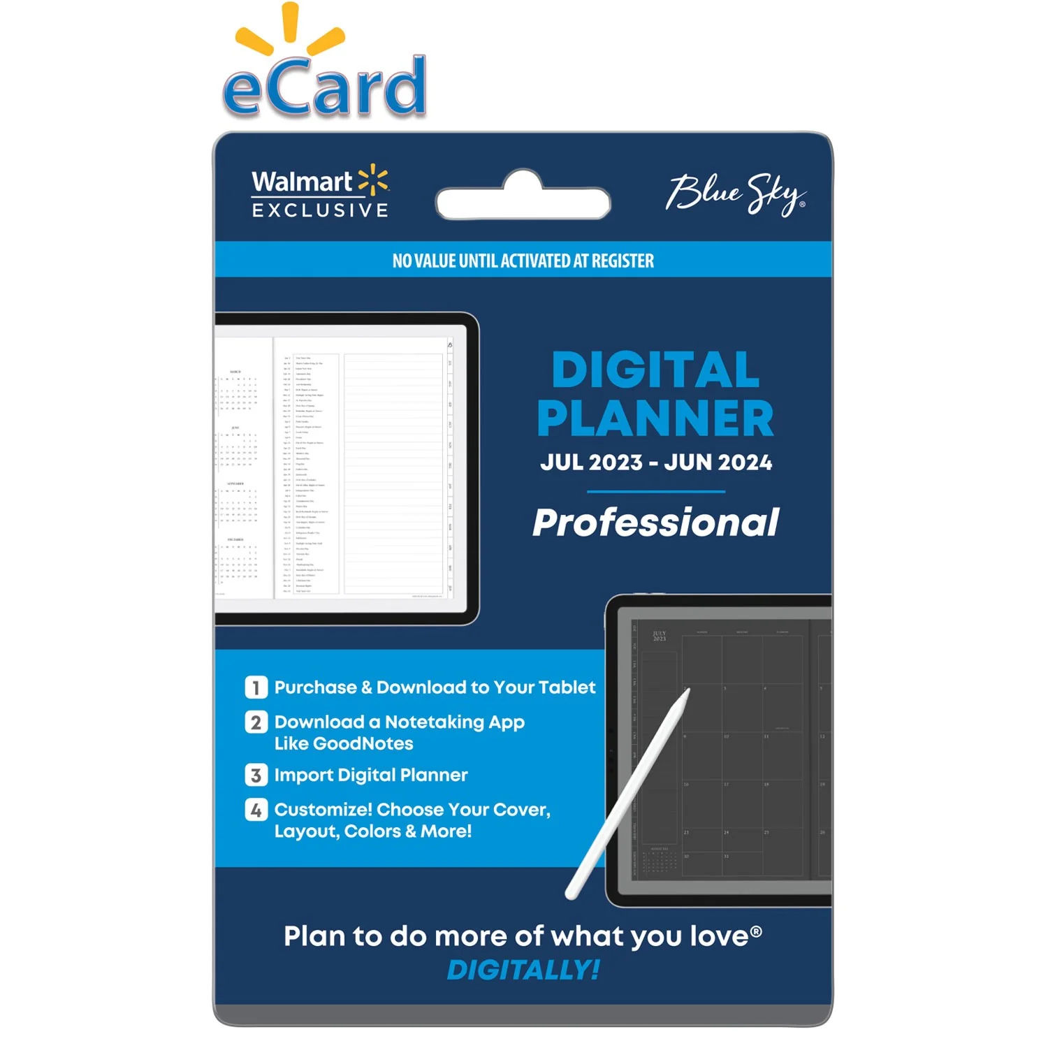 We are now entering the next frontier in planning with our latest innovation, the Blue Sky® Digital Planner. Offering our best-selling paper planner layouts in a digital format creates boundless combinations of vertical and horizontal options, as well as endless notes pages and extra content pages. Within your digital planner bundle, you’ll receive a weekly digital planner and monthly digital planner, available in both light and dark modes. Your Professional Digital Planner will also include interchangeable sleek, office-appropriate cover designs and tab colors, as well as productivity-themed digital sticker packs. Created for optimal use on a writable tablet, this paper-free, sustainable planner solution is available exclusively at Walmart and Walmart.com, in both Fashion and Professional options, dated for the academic year from July 2023 to June 2024.